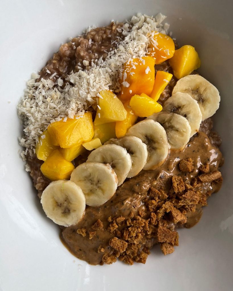 Bananas, chia, sweetened and unsweetened coconut flakes, nuts, nut butter, seeds, cookies, chocolate chips, dried fruit, fresh fruit, spices, protein powder (usually chocolate), coffee powder, and mushroom coffee powder are all go-to’s for me.