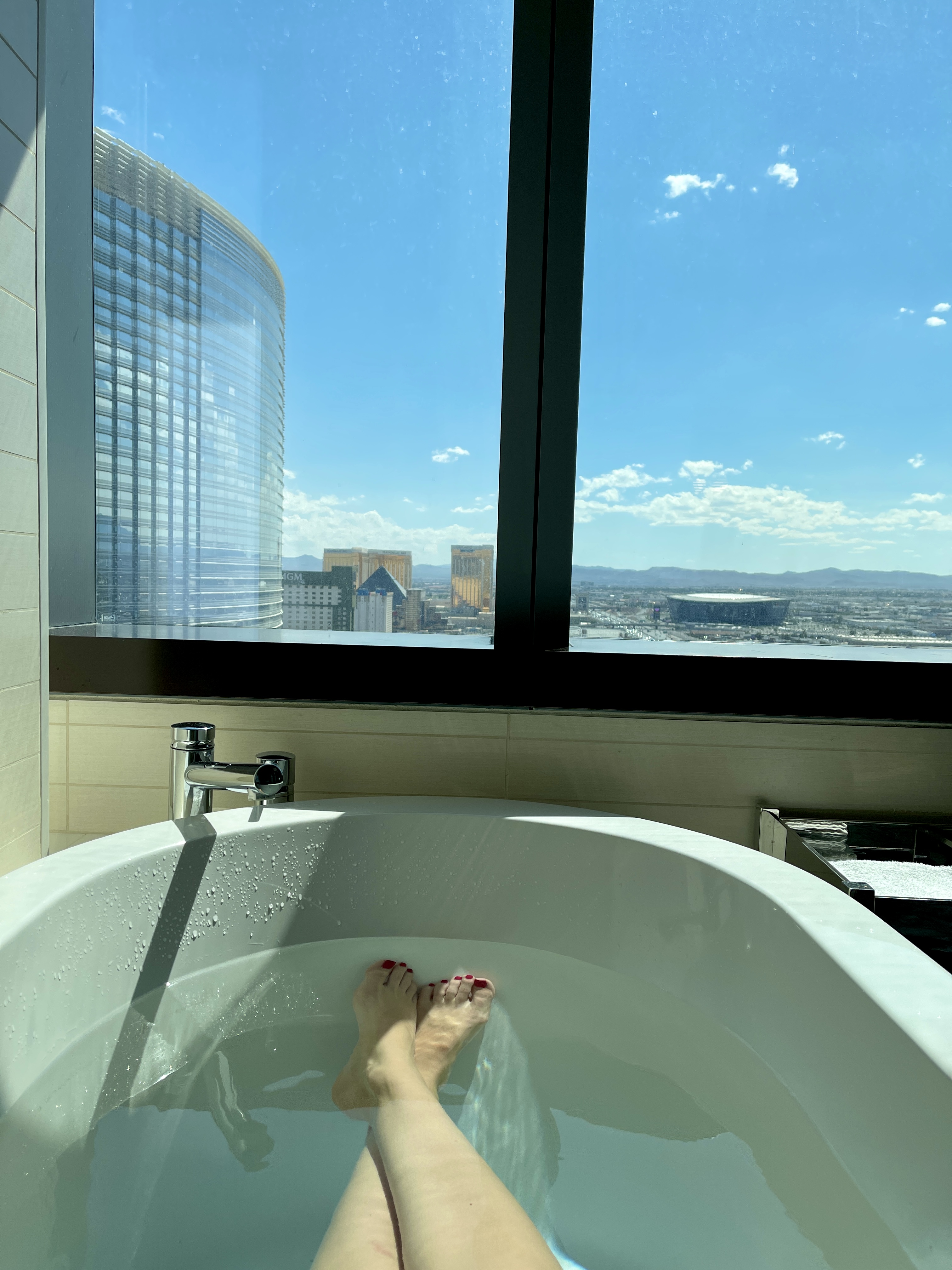 If you aren’t a big gambler, (I didn’t gamble at all) staying at a hotel that isn’t also a casino is really nice. I stayed at the Vdara, which was very fancy πββοΈ, really quiet, and big bonus- no smoking! The room and the view were absolutely incredible. I did a little work while I was there, a let me tell you, I did not mind at all with that view to look out at. Growing up in a valley, surrounded by mountains, I felt really nostalgic and a little homesick looking out at the open blue sky and big mountains in the distance.