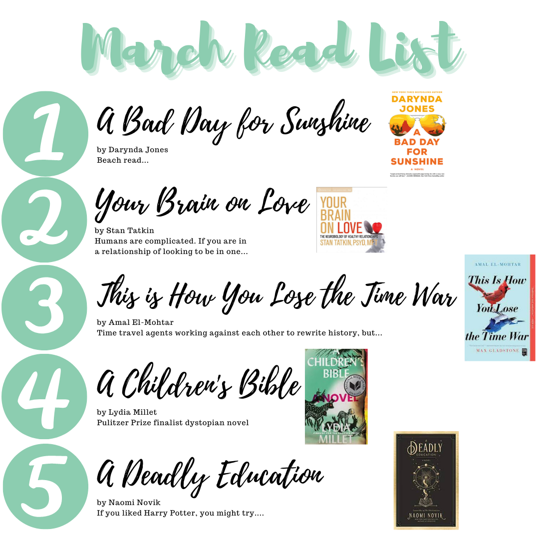 In March, all of the books that I read were on my TBR (to be read) list, and all but one I got from the Goodreads voting “best of” lists.